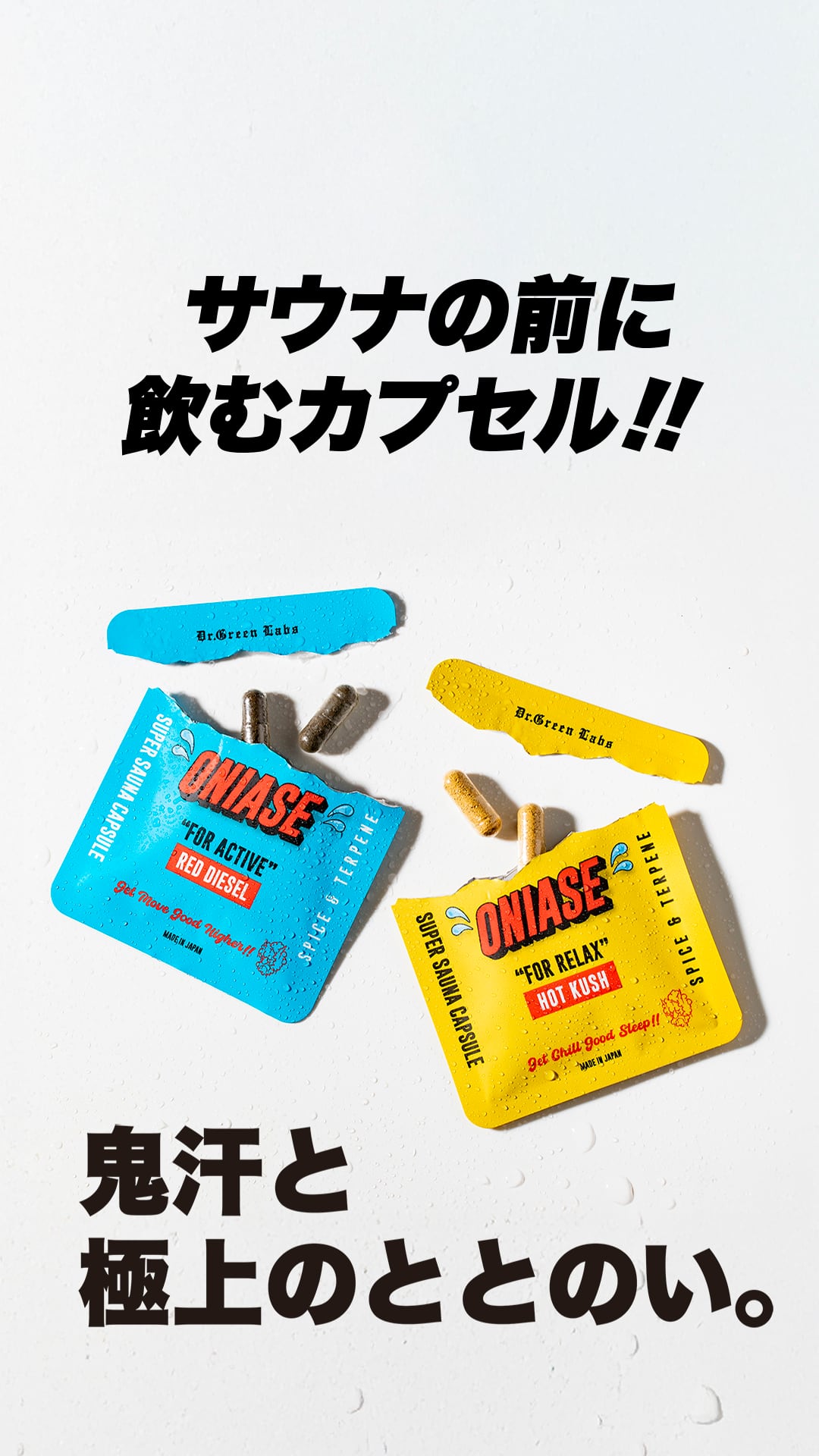 CBDと植物テルペンのパイオニア「Dr. GREEN LABS」とスパイスマスター「スパイスのガネーシャ」がサウナ向けに共同開発。スパイスとテルペンとサウナを掛け合わせた次世代型サウナアイテムの誕生です。 発汗をアシストするスパイスと、深いととのいへと導く天然由来のテルペンをたっぷり含んだ植物抽出物を調合しカプセル状に仕上げたこのプロダクトは、サウナの前に飲むことで極上のととのいを演出します。 辛味成分ジンゲロールの含有量が他種を圧倒する高知県産の黄金生姜を軸に、ブラックペッパーと花椒をベストバランスで調合することで、発汗作用を最大限に高め、鬼のような汗をかきます。 これが商品名「ONIASE」の由来でもあります。 そして、汗をかくだけじゃありません。 テルペンとは? テルペンとは、植物の花や葉、果実などの精油に多く含まれる自然由来の芳香成分。脂溶性の有機化合物で自然界に広く存在しています。 数百種類あるとされているテルペンにはそれぞれの作用があり、アロマオイルに様々な効果・効能があるのは、このテルペンによる働きが大きいのです。 ONIASEにはテルペンの世界的パイオニアであるEYBNA社が、イスラエルの最先端ラボにて抽出・配合した、テルペンを豊富に含んだ植物抽出物をサウナ専用に独自にMIX。 それぞれの利用シーンに応じたACTIVEとRELAXの2種類があり、ACTIVEテルペンとRELAXテルペンを1粒あたりそれぞれ40mg配合しています。 サウナ体験アップデート方法 1.サウナに入る30分くらい前に1粒飲んでください。 2.より効果を感じたい方は2粒がおすすめです。 3.いつもより水分補給をしっかりと。 4.サウナ、水風呂、外気浴を数セット行い、ONIASEを体感してください。 安心安全 ・100%天然植物由来の原料のみ使用 ・国内にて製造 ・本製品にはCBDは含まれておりません